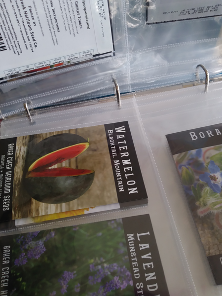 Several sources online have suggested using a photo album as seed storage. I purchased a three-ring binder and some 4×6 photo inserts, and it works great! No more random, messy stashes of seeds.