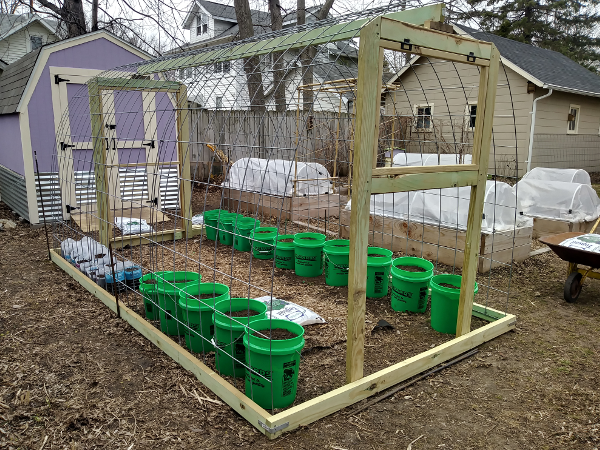 The buckets will be replaced by raised beds and shelves, and the plan is to do that by the end of fall. We look forward to having homegrown leafy greens through some of next winter.