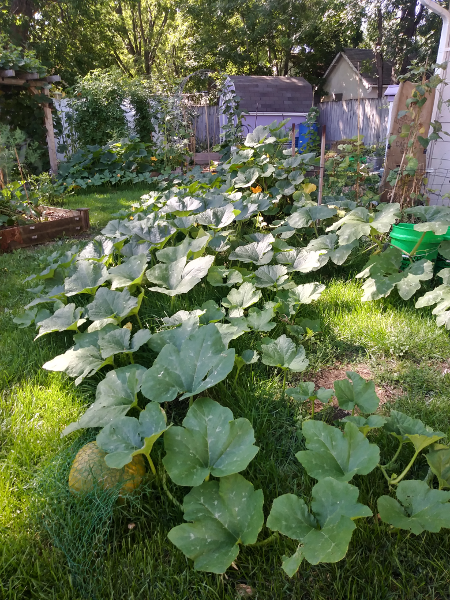 The nice thing about pumpkins is that they will produce fresh roots along the vine. Because of vine borer damage, I had pulled one of the plants from a raised bed, and lopped off its base. It grew new roots farther along the vine, and has been growing fine outside the raised bed. That’s the one in the distance, in the photo above.