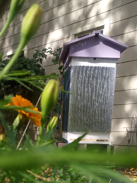 It’s probably not time yet to wrap the beehive for winter. Reflectix is a great solution for shorter periods of cold. I Gorilla taped shims to the inside of this diy wrap. That is to create air space, so that the Reflectix can act as a bit of insulation as well as a wind block. I use heavy duty Velcro at the edges to close it around the hive.