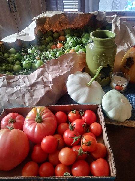 I’ve been freezing cherry tomatoes. They will store that way for up to a year, although they will be more suitable for using in sauces. So far, we’ve been eating the oxheart tomatoes as they’ve grown, but now I’ll have to store some.
