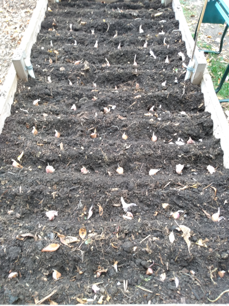 Place the cloves about four inches apart in the trenches. Yes, mine can be a tiny bit squishy for space, but not too bad.