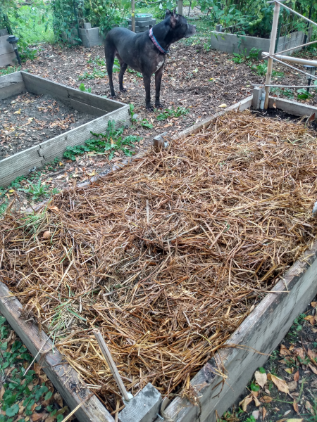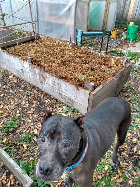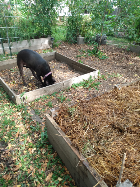 Cover the cloves, and bed them down with a drink and several inches of straw. Remark that I need to get more straw, as it’s running kind of low. Know that “someone,” can’t answer with words, but is thinking about bringing me her ball to throw.