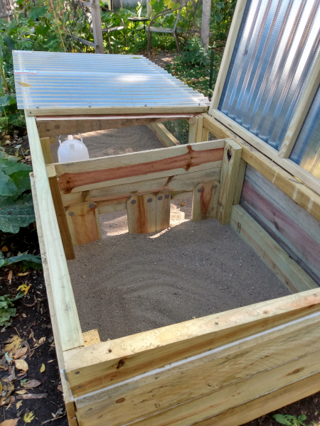 There is 1/4″ hardware cloth on every side, including the top and bottom. Only one of the roof panels is metal, so there is a sun and shade mix. The shelter is three feet wide and long, and the open run is five feet long. The bottom is several inches of sand, which quail love, and I’ll add straw to the coop, which they also love.